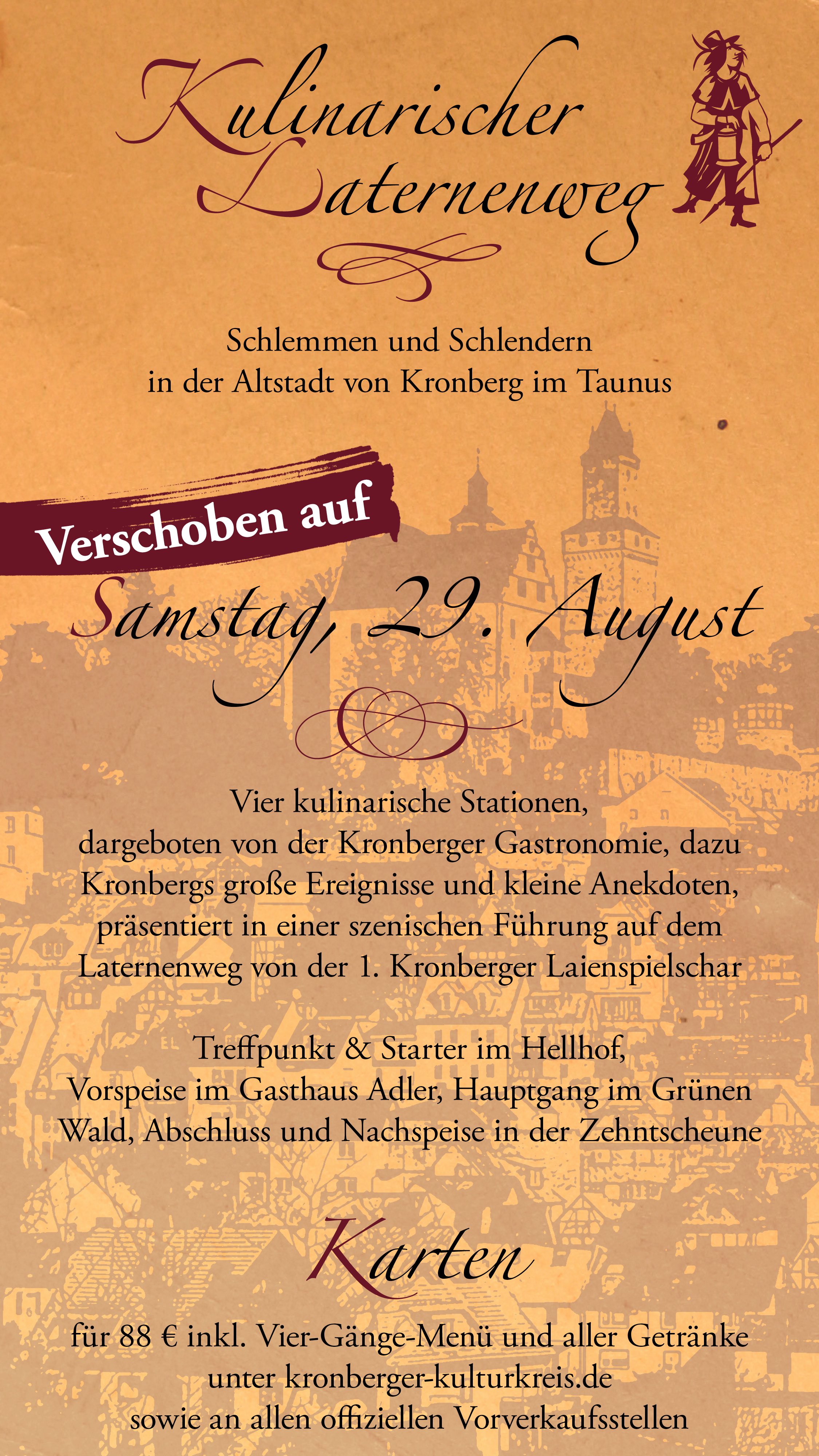 Die 1. Kronberger Laienspielschar lässt entlang des Kronberger Laternenweges Geschichte lebendig werden. Eine szenische Führung entführt Sie in die Zeit der raufenden Ritter und der streitenden Prälaten und begleitet Sie durch die Geschichte Kronbergs.