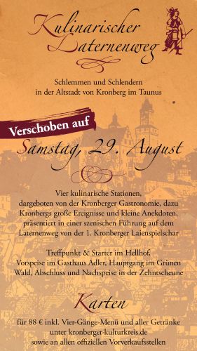 Die 1. Kronberger Laienspielschar lässt entlang des Kronberger Laternenweges Geschichte lebendig werden. Eine szenische Führung entführt Sie in die Zeit der raufenden Ritter und der streitenden Prälaten und begleitet Sie durch die Geschichte Kronbergs.